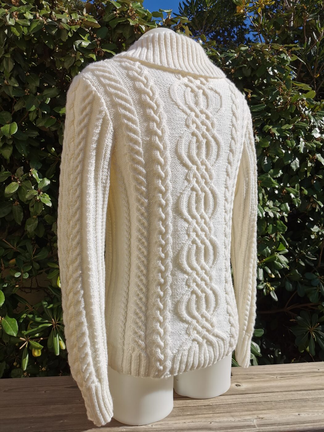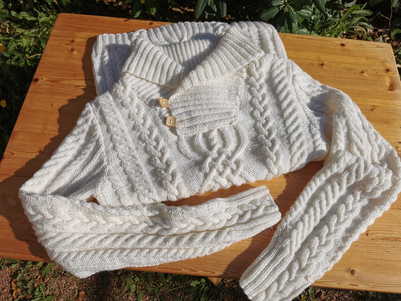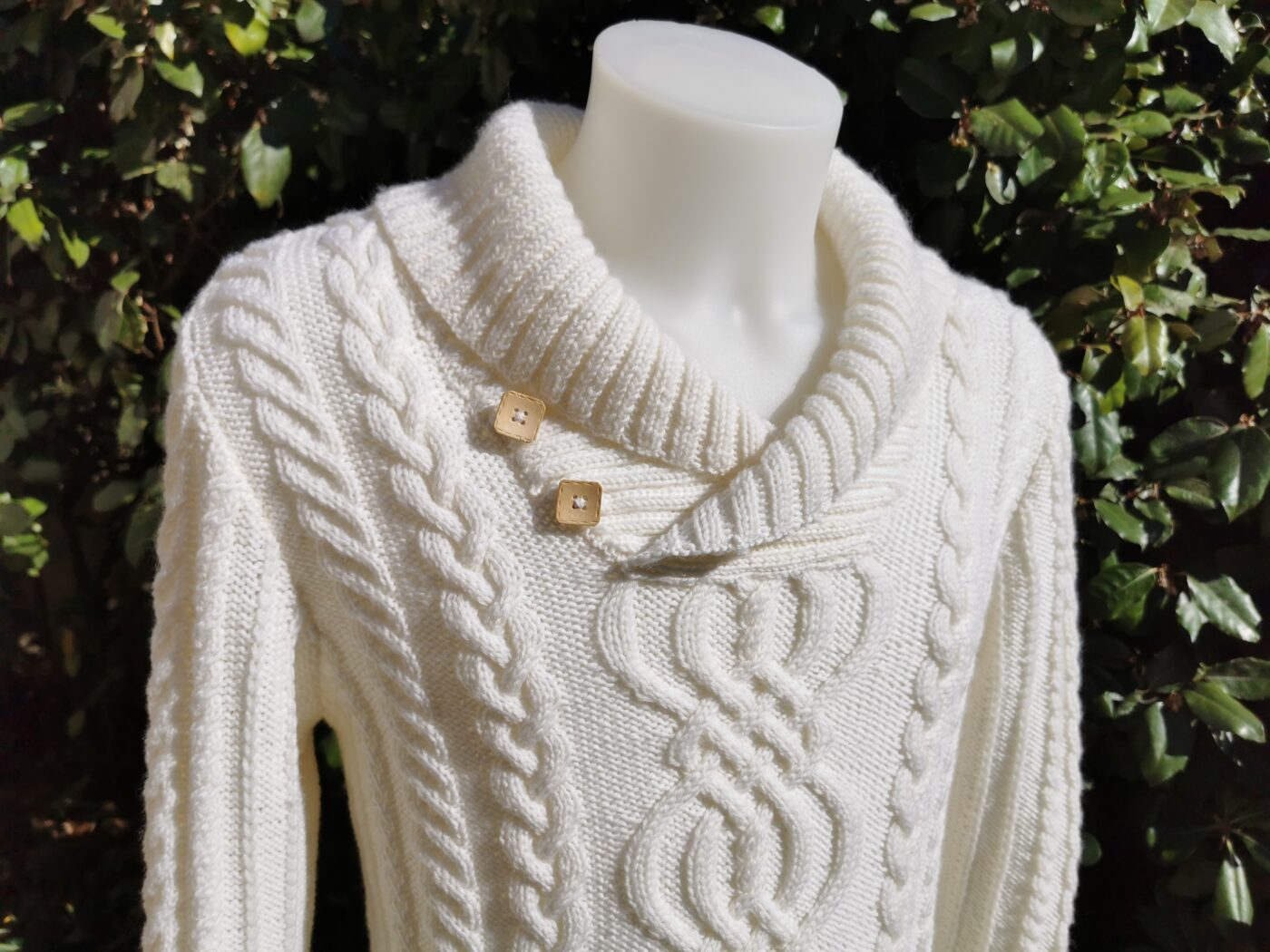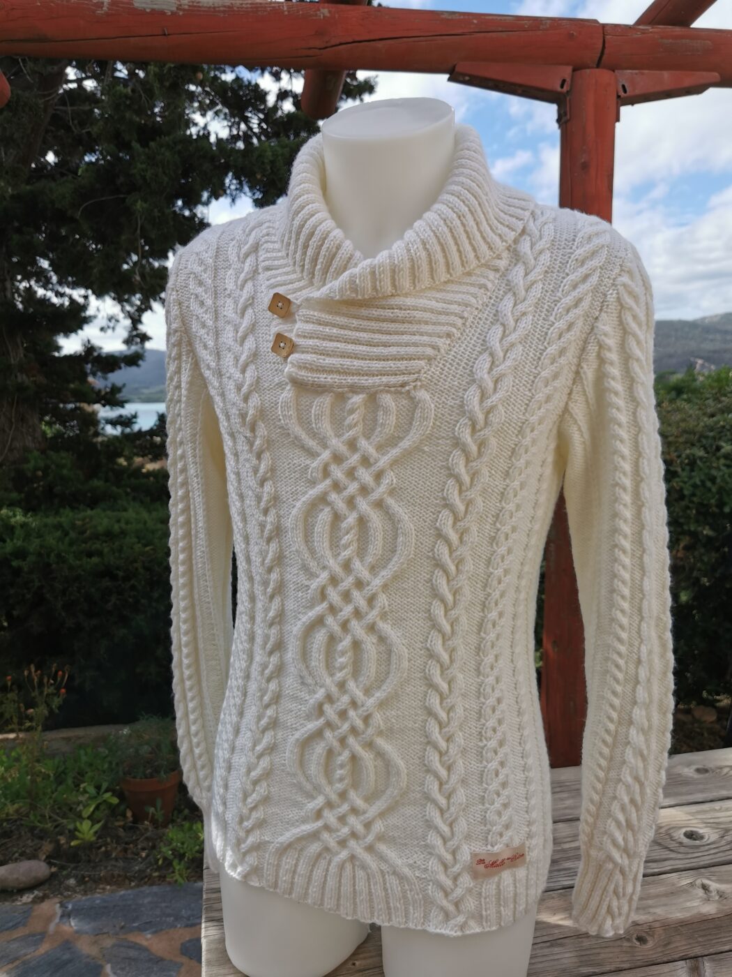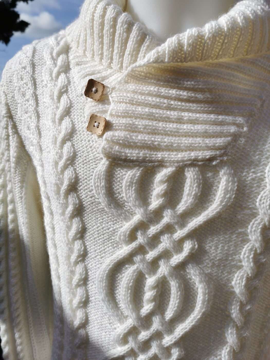 Douceur, chaleur et légèreté pour cet exceptionnel pull irlandais. Confectionné à la main artisanalement à partir d’un fil noble de pur mérinos, ce sublime pull séduit par sa matière douce, la perfection de ses torsades ainsi que son col modulable. Ce dernier se porte à l’envie soit ouvert, tel un col en V, soit boutonné pour vous envelopper de chaleur et d’une incomparable douceur. Le tableau ainsi que la torsade centrale sont une création originale dessinés pour cet ouvrage. Ils reprennent des torsades traditionnelles des îles d’Aran, dont certaines ont été adaptées pour offrir davantage de finesse, relief et distinction.